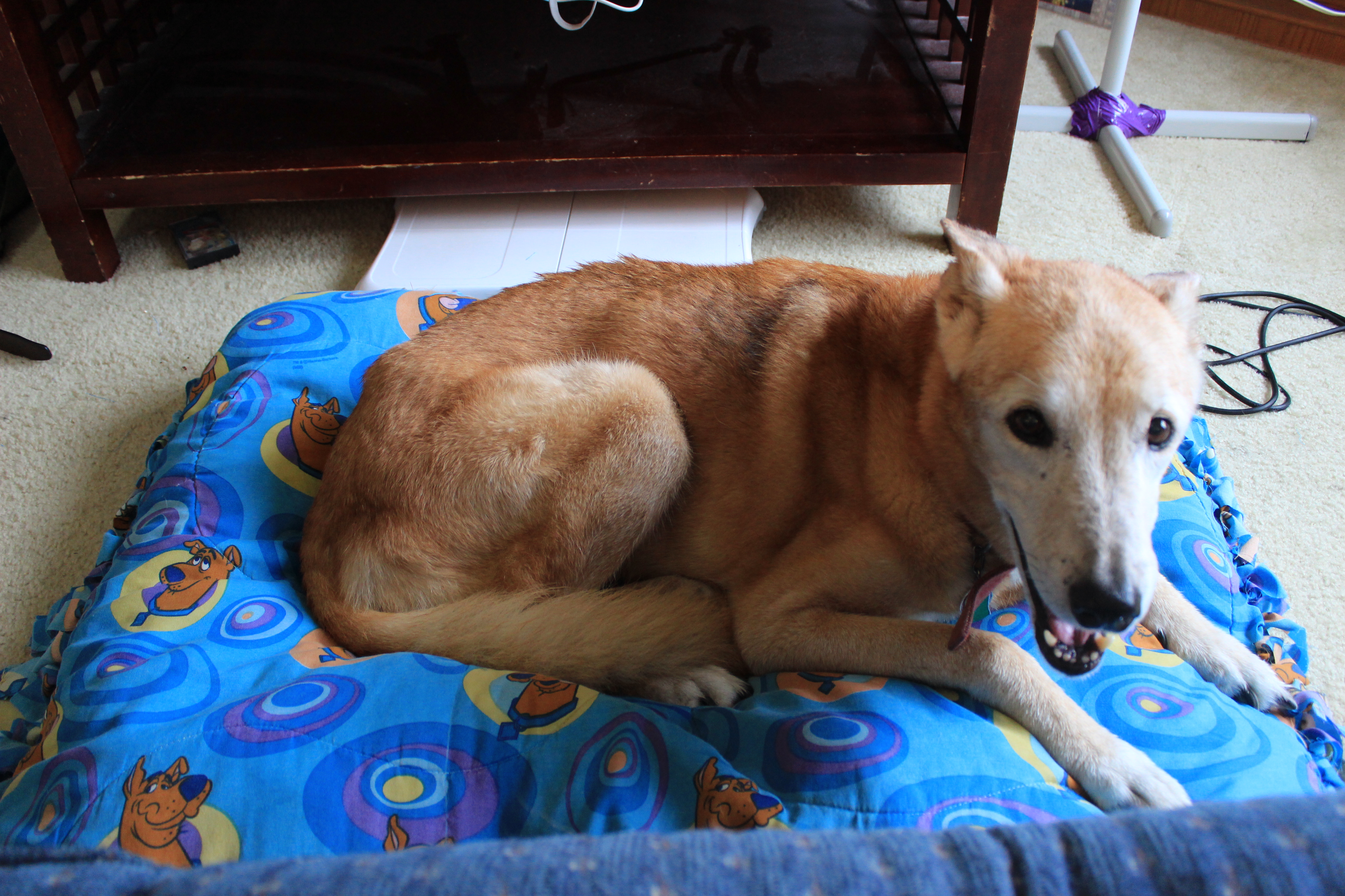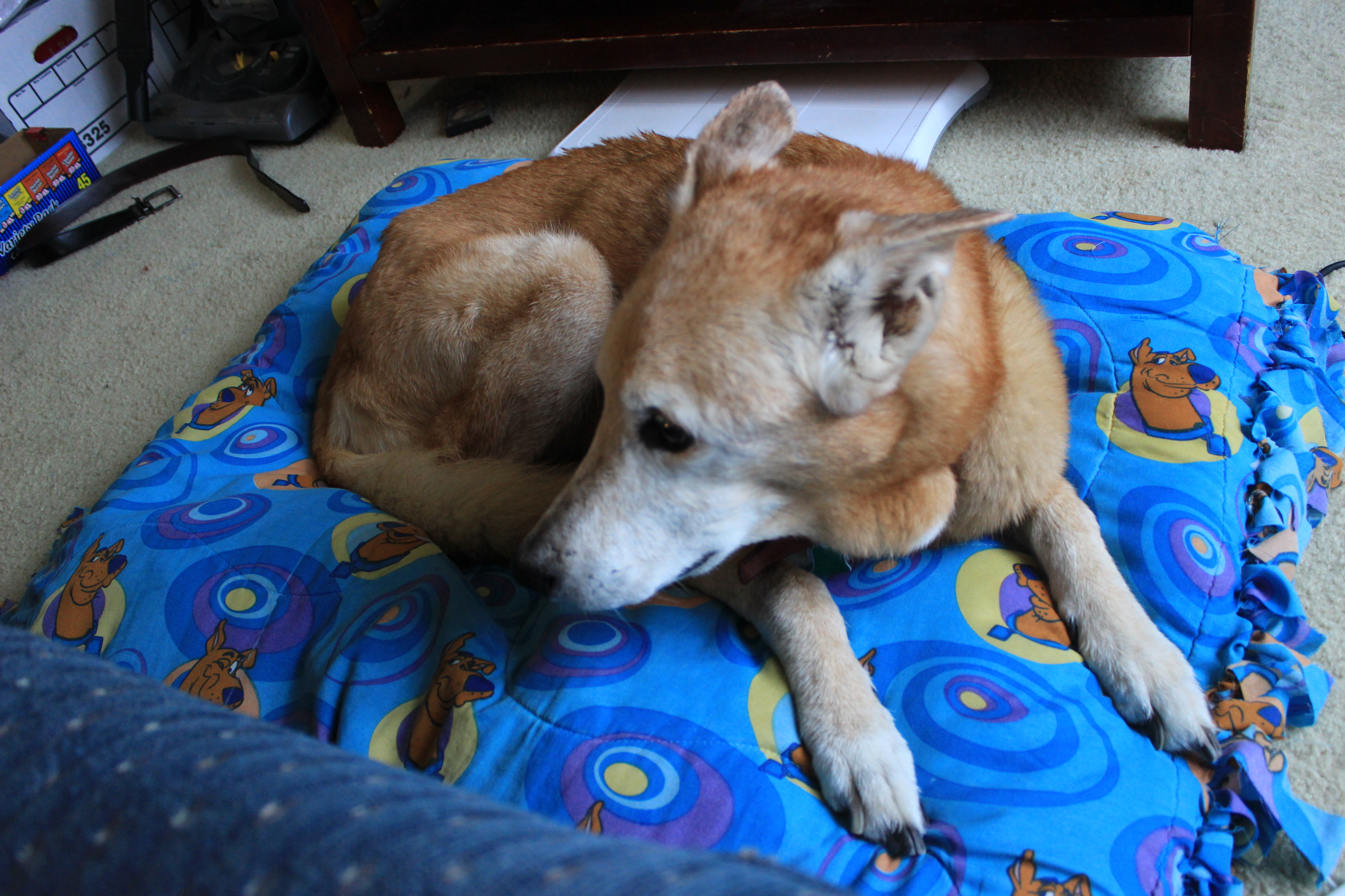 For a while now my family dog, Abigail has been using my brother’s old scooby-doo blanket as her bed. ( We’ve been calling scooby-doo her boyfriend ever since). I decided to turn her worn out blanket into a comfortable dog bed.