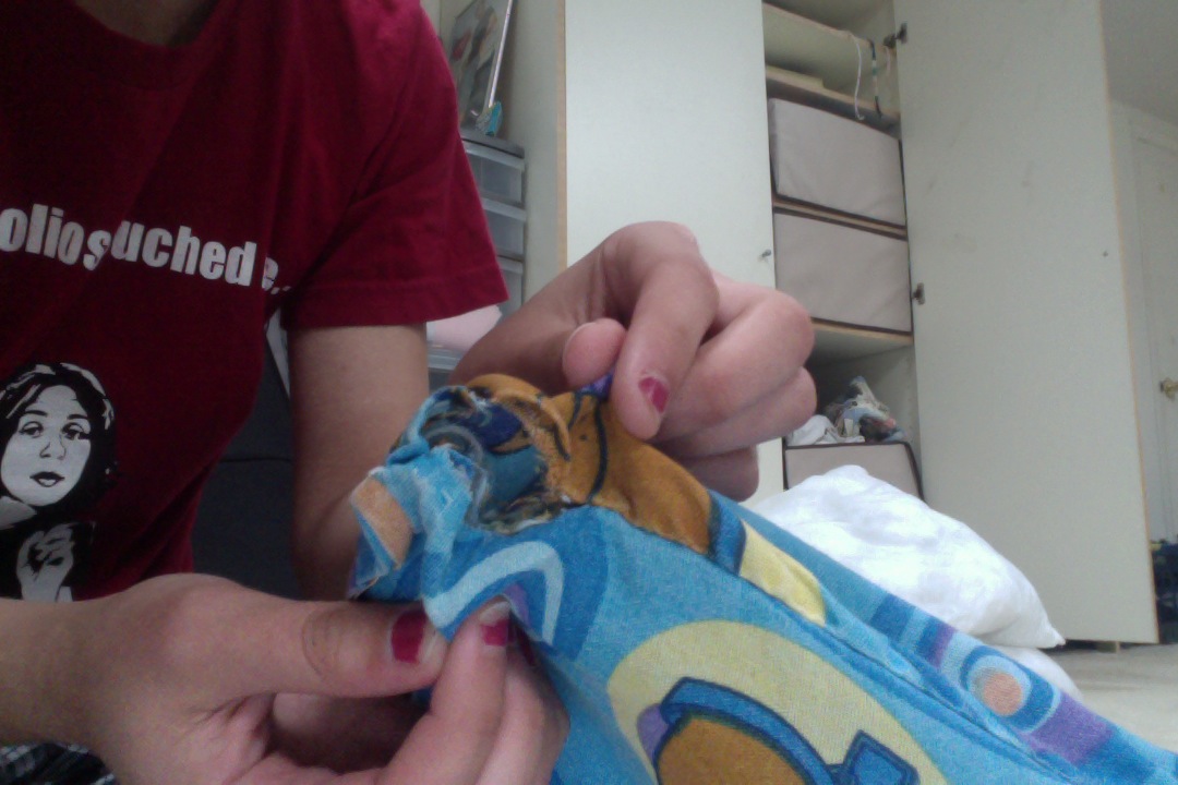 First, fold the material to the whatever size you desire. (I decided on folding the blanket in half, as shown in the picture above- mind you it was a children’s blanket so it wasn’t too large to begin with). Take into consideration that you will need to leave enough room on the 3 unfolded edges for strips to tie, so the size of the bed will actually be 3 inches less on each of those edges.