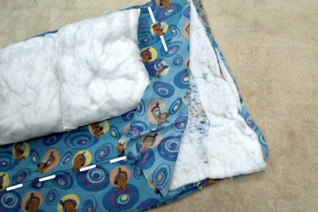 Towards the middle of the folded material there was a larger stitched section which I decided would be the base of the bed, as represented by the dashed lines in the picture. I cut the excess stuffing around the three unfolded edges.