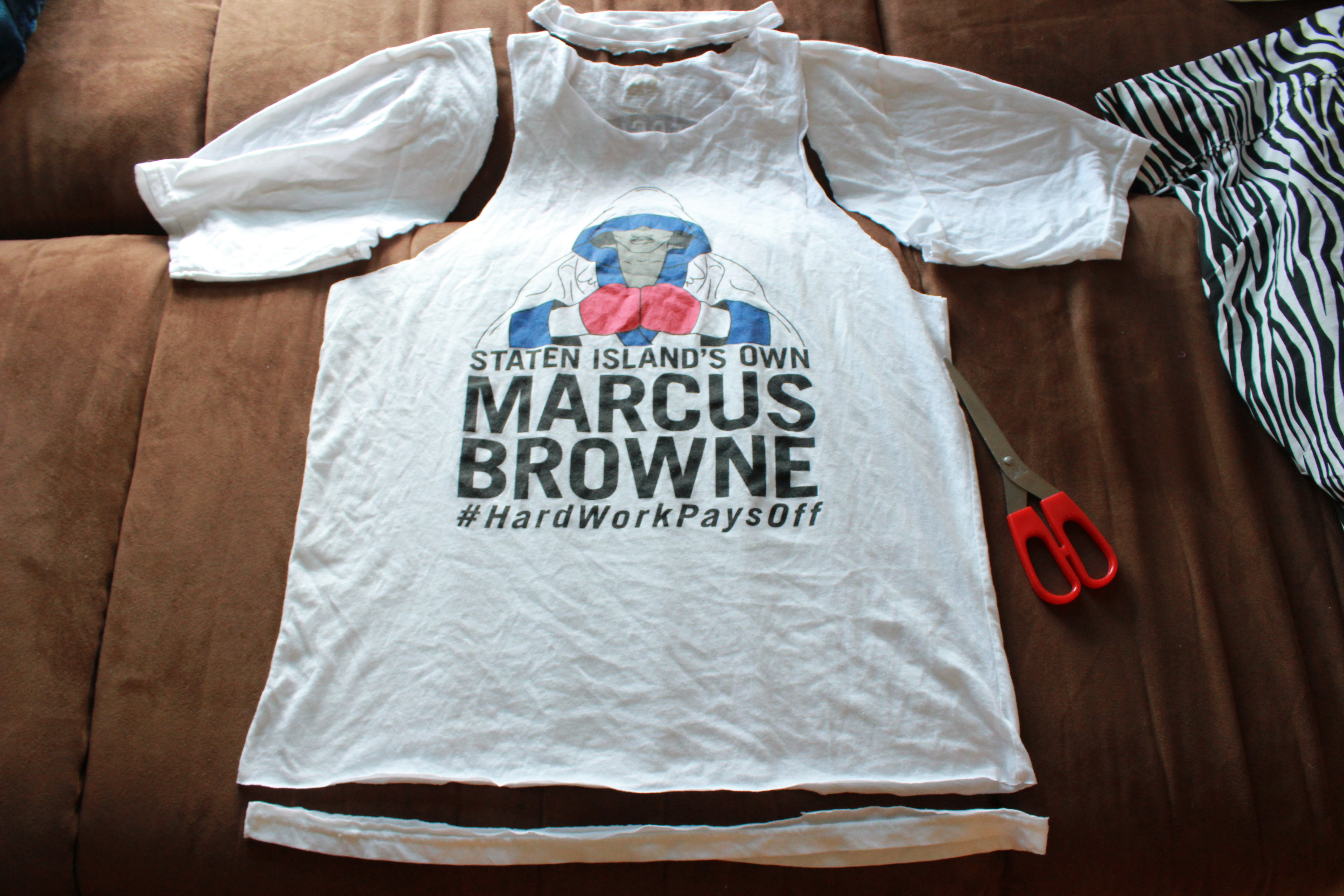 I began to follow along with this easy-to-follow tutorial, however I realized that I really liked the back of the shirt I was working with ( I especially liked the motivational words!) Instead, I chose to cut slits around the circle which would allow for more air circulation when working out. Although, I really do like the idea of a racerback tank, as described in rabbitfoodformybunnyteeth’s tutorial and I plan on making one in the future! (maybe one that’s even braided in the back!)