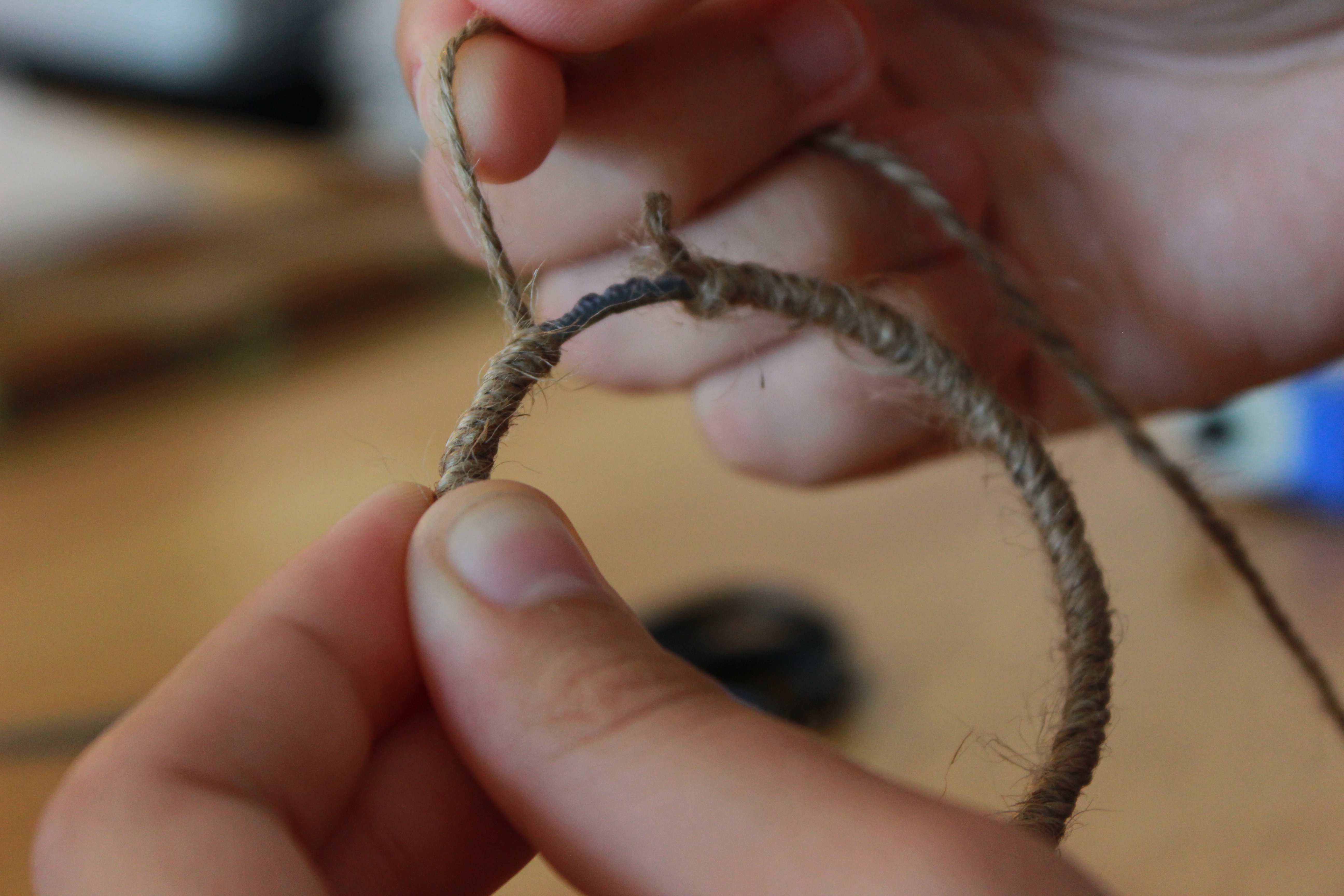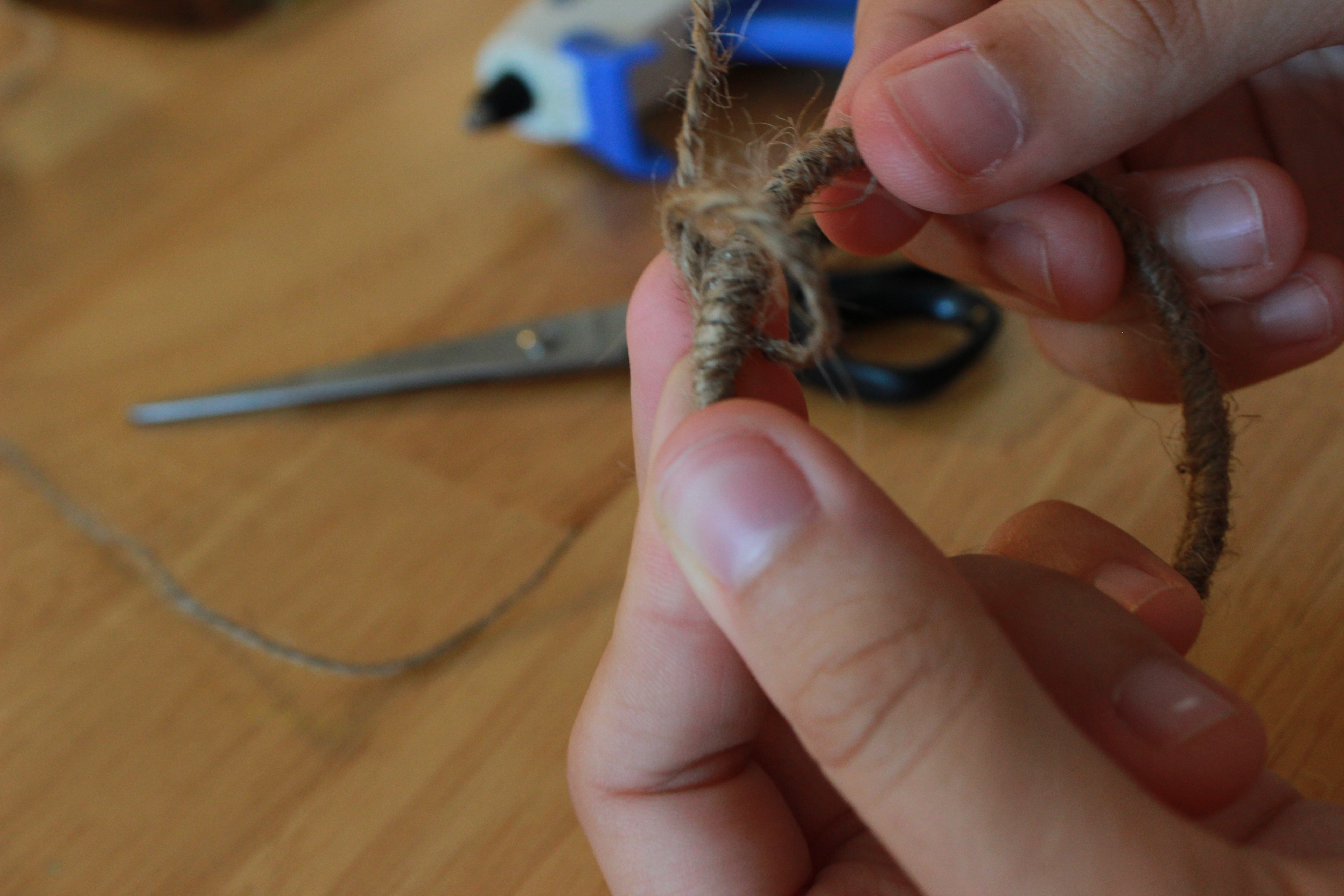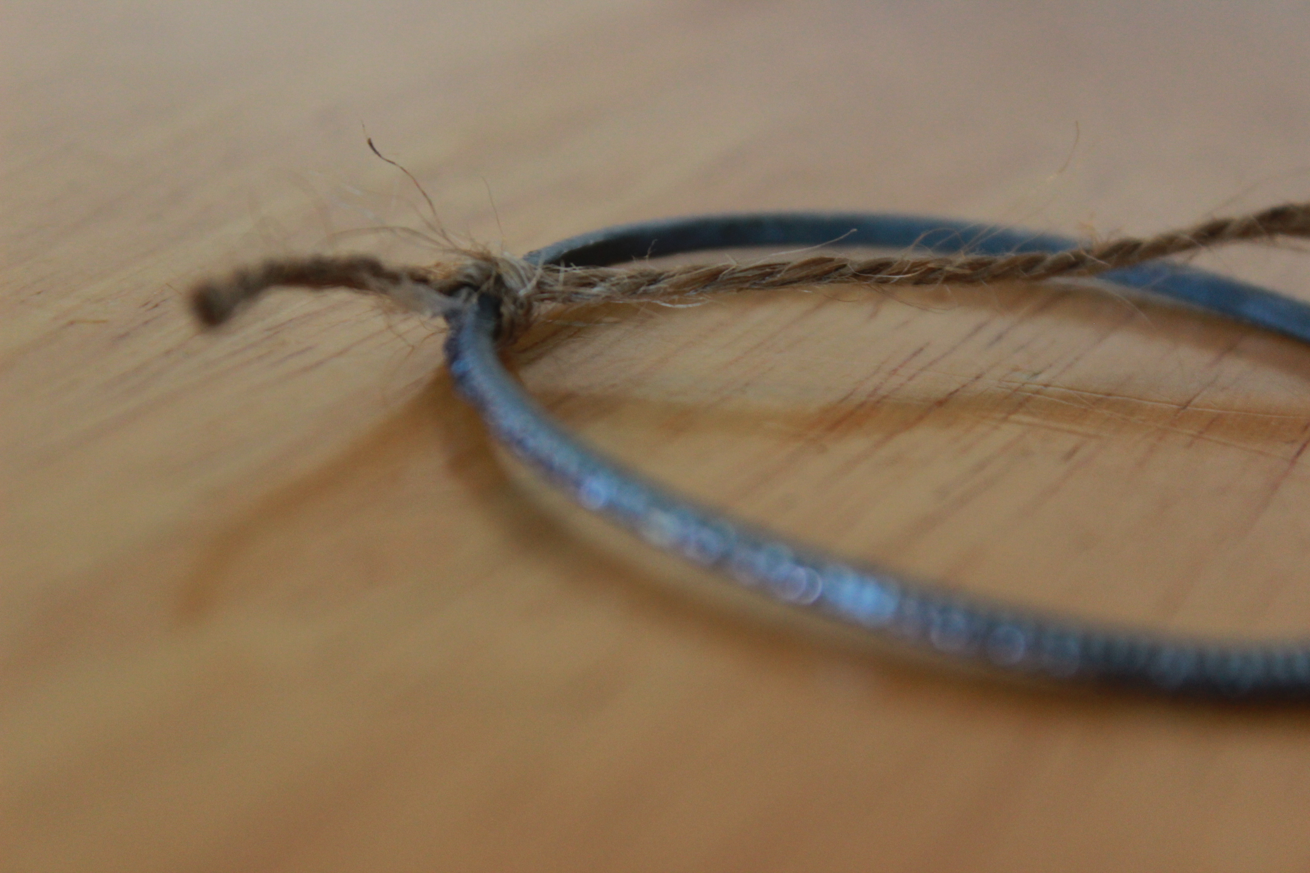 First, tie a knot with the twine around the bangle bracelet and secure with a dab of hot glue. Begin to wrap the twine tightly around the entire bracelet. (I didn’t use glue again until I wrapped the twine all the way around the bracelet, where I secured it once again with a knot around the bracelet.) Instead of using twine, you can also use yarn, string, or leather. I personally chose twine, because I liked the texture and color of it. (I wanted to go with a more neutral/natural look for my earrings.)